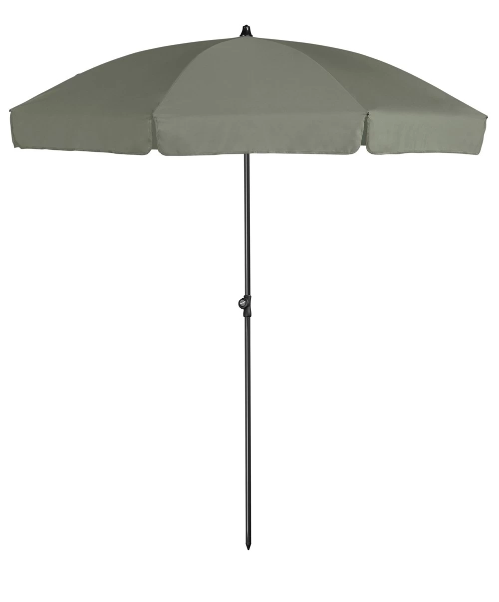 Parasol Aruba ΓΈ200 volant. Klassiek, kantelbaar model parasol met 160 grams polyester doek in de kleur olijf. De volant geeft extra schaduw bij een laagstaande zon. Kan ook als strandparasol worden gebruikt en rechtstreeks in de grond worden geprikt.