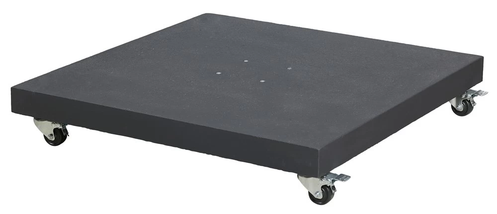 Voorzien van zwenkwielen waardoor de parasolvoet makkelijk te verplaatsen is. Deze natuurstenen parasolvoet is vervaardigd van speciaal geselecteerd graniet en zwart gevlamd. Geschikt voor o.a. Platinum zweefparasols Challenger, Solarflex, Deltawing en Falcon. Een stevige parasolvoet voorkomt dat uw parasol omwaait en schade veroorzaakt. Laat een parasol nooit onbeheerd achter en sluit deze bij opkomende wind.